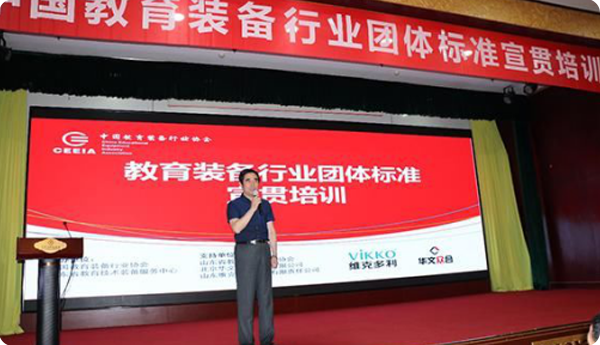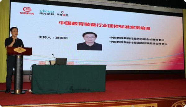 中国教育装备行业协会副会长兼秘书长夏国明的主持会议并致辞,阐述了团体标准如何为教育装备工作提供有效指导和方向的引领。