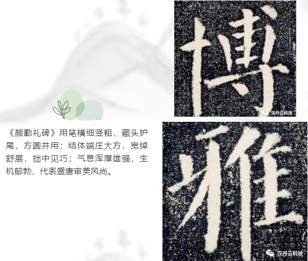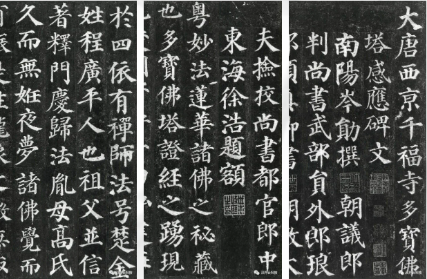《多宝塔碑》用笔丰厚遒美,腴润沉稳;横细竖粗,对比强烈;结体严谨致密,紧凑规整,平稳匀称。学颜体者多从此碑入手,入其堂奥。