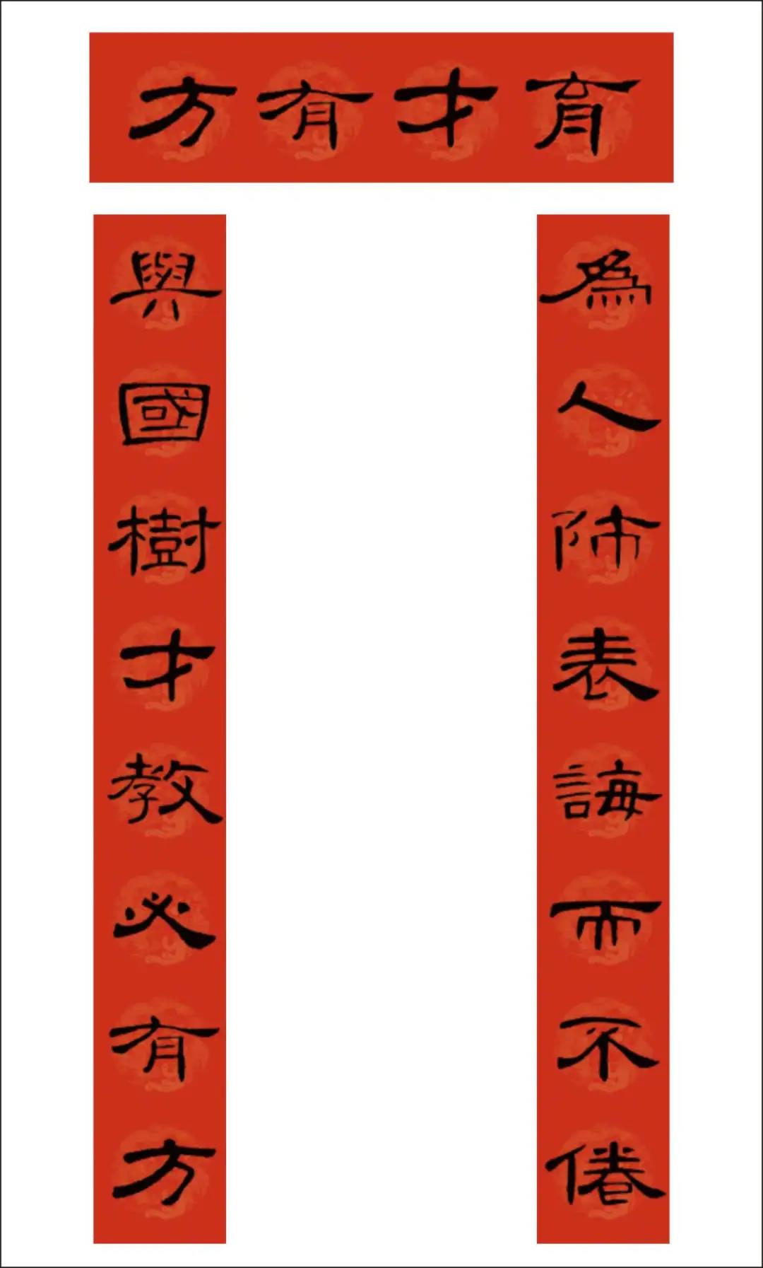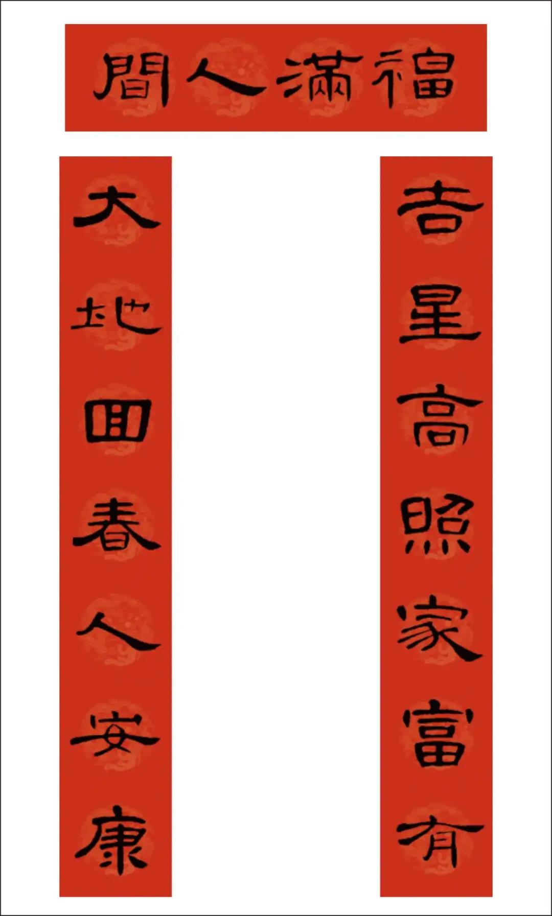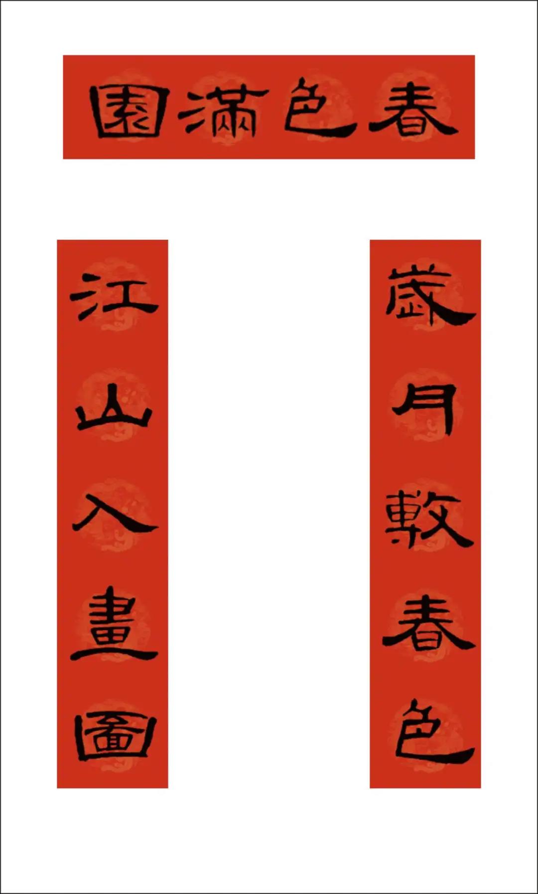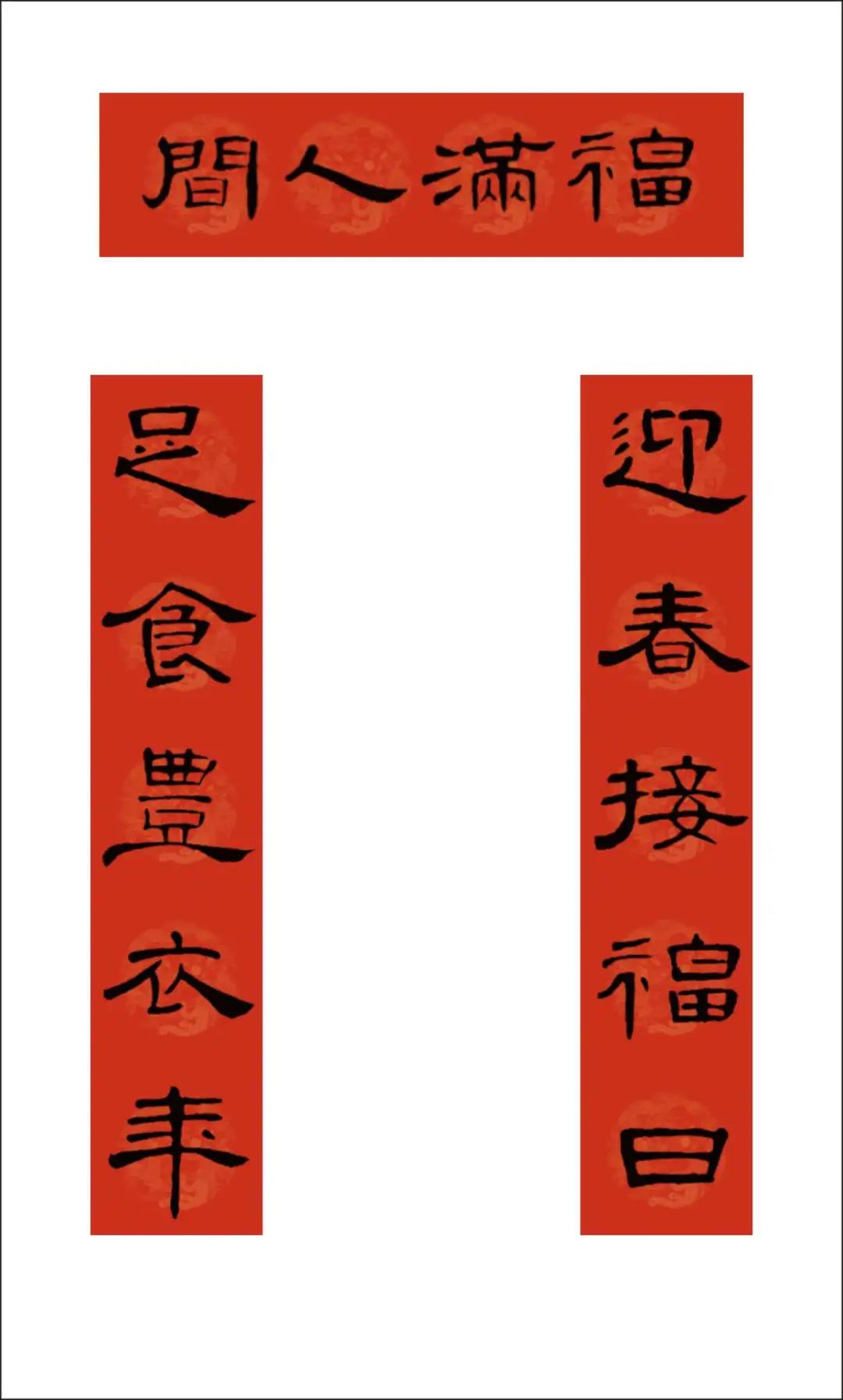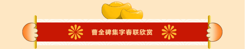 曹全碑集字书写的春联,圆实活脱刚柔相济,静穆润和严整美观。配上吉利讨喜的祝福语,喜庆的大红色春联纸张,春节的节日氛围顿感浓郁。正可谓: