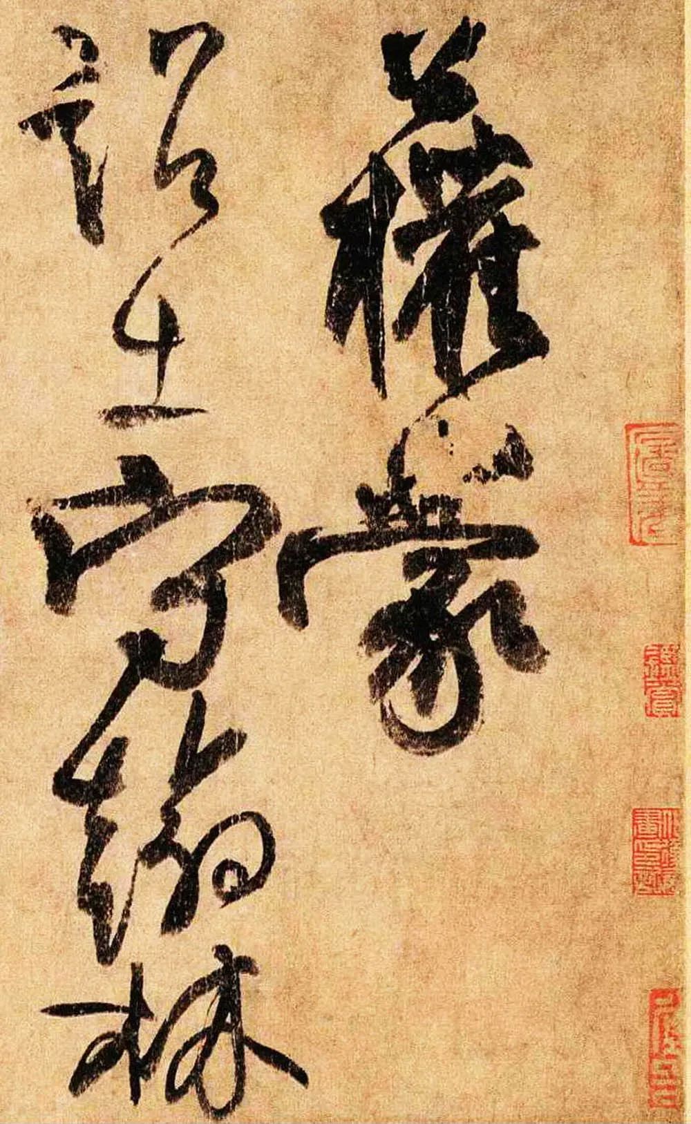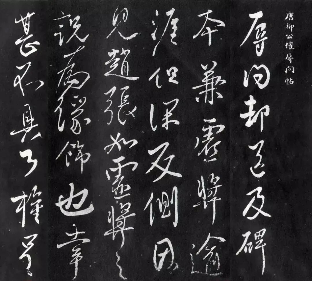 用笔雄健,气势豪宕,第一行“公权蒙”三字联绵出之,字硕大,笔力纵横,如见柳公权血气方刚,精魄四射。其后三行笔走龙蛇,曲折连环;行间大小错落,锋出则破空杀纸,游丝则刚柔兼济,气势一泻无碍。