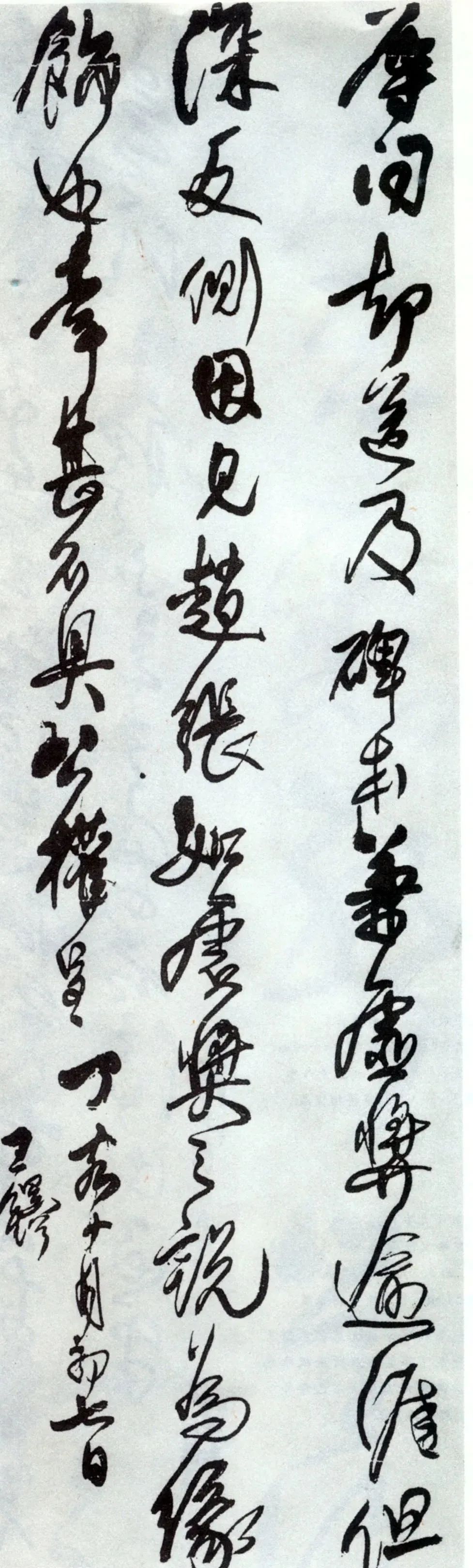 傅山临古学习,方法多变,不拘一格,师古不泥,他的临本连缀萦带,用笔奔放,气势磅礴。取其大势,并加以改造创新,浑然一体成自家之面目。傅山书法线条活泼,以篆隶入草,使草书的线条质量得到强化。他在草书上得与王铎并列,成为明末清初书坛的中兴之主。