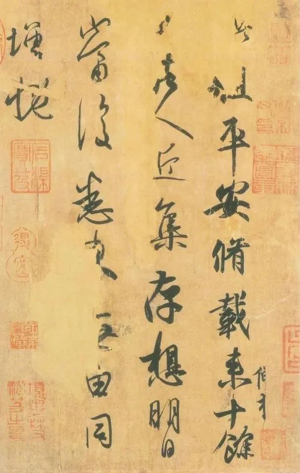 此帖书风与颜真卿行书极相近,笔力沉练,苍劲古朴;用墨枯润相间,老笔纷披。清刘熙载《书概》云:“景度书机括本出于颜,而加以不衫不履,遂自成家 然学行,不衫不履其外焉者也”