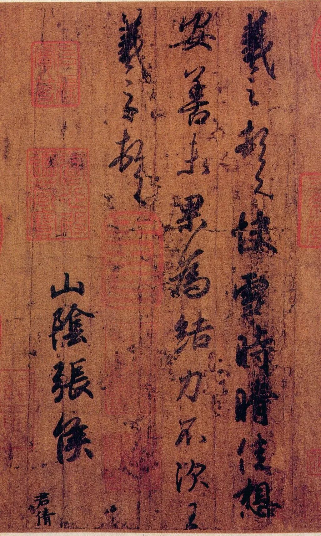 《苕溪诗卷》米芾38岁所书。此卷用笔中锋直下,落笔迅疾,纵横恣肆。尤其运锋变化丰富,点画波折连贯,提按起伏自然,毫无雕琢之痕。其结体舒畅,中宫微敛,保持了重心的平衡。通篇字体微向左倾,多攲侧之势,于险劲中求平夷。全卷书风真率自然,痛快淋漓,变化有致,逸趣盎然,反映了米芾中年书的典型面貌。