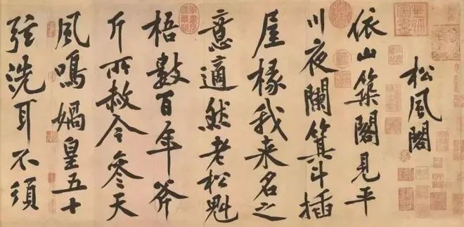 此帖是黄庭坚与朋友游鄂城樊山,途经松林间一座亭阁,作了这首“松风阁”的诗,歌咏当时所见景物,并表达对朋友的怀念。这件书迹长波大撇,提顿起伏,一波三折,像是船夫摇桨用力的样子。下笔平和沉稳,变化含蓄,轻顿慢提,婀娜稳厚,意韵十足。是尚意书风的典型。