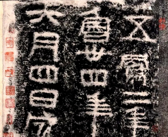 《五凤刻石》是篆隶递变中的古隶,属典型的隶形篆笔风格。以方扁结构为主要结字形式中掺杂着纵势结构,具有明显的从篆书脱胎而来的痕迹,与商代墨书甲骨文、宰丰刻辞、秦隶等一脉相承。看似圆浑凝练的篆意笔画中具有浓厚的隶书态势,颇具风趣。
