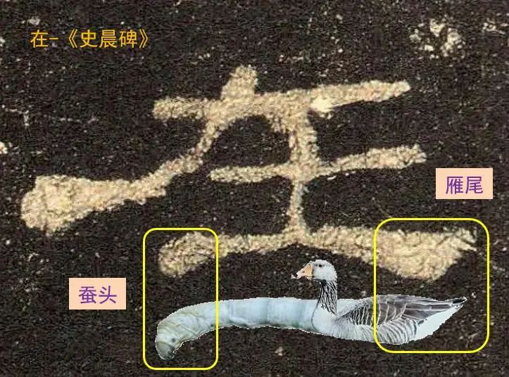 隶书中的主笔横、捺画波磔(zhe)明显。起笔时藏(逆)锋,形若“蚕头”,收笔时按笔上挑形若“雁尾”。
