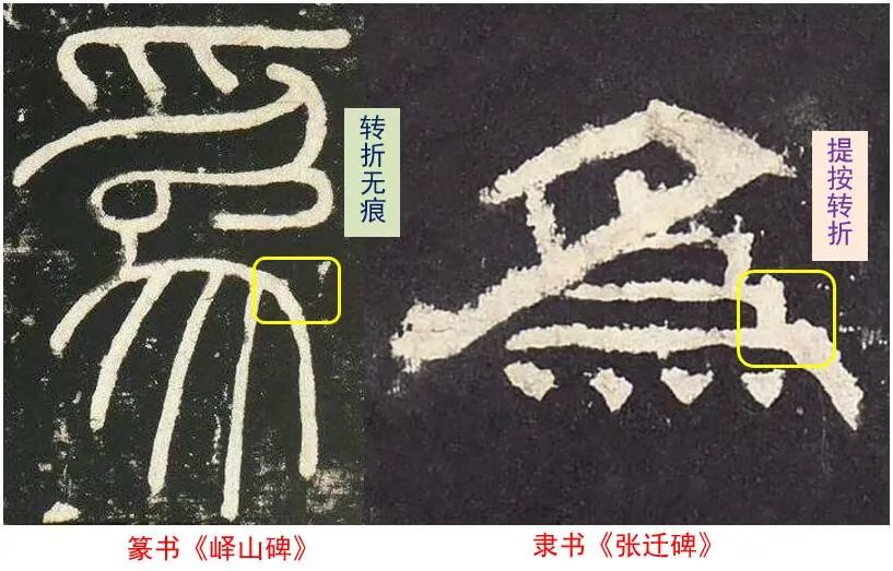 篆书转折圆滑不现痕迹,隶书转折强调提按,痕迹明显。