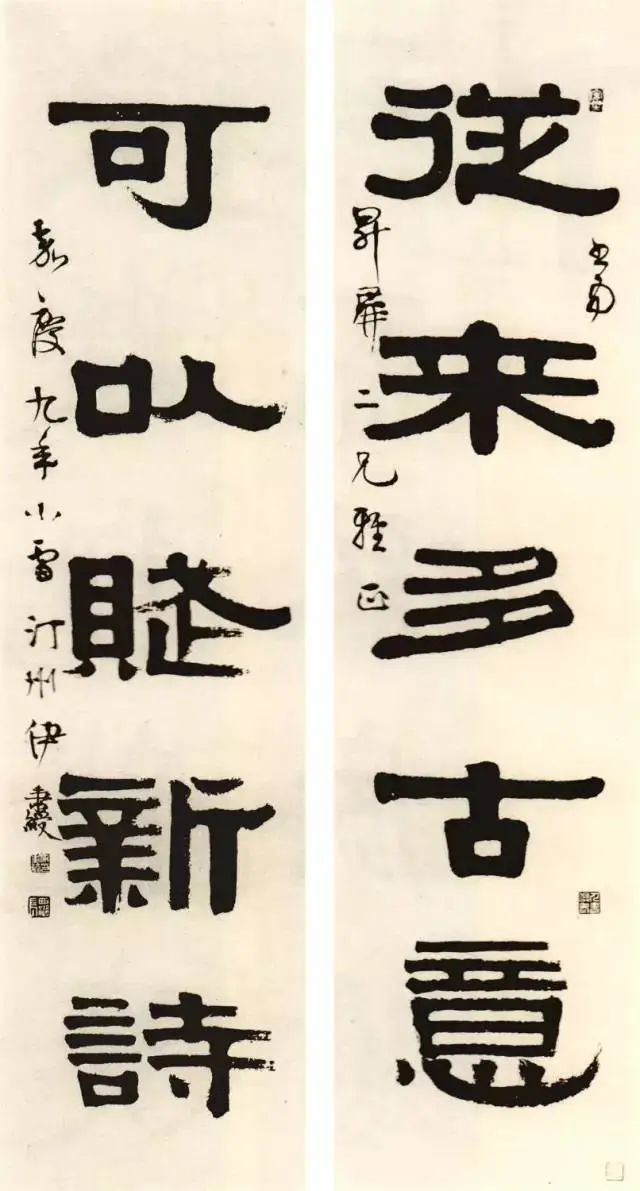 伊秉绶(公元1754-1815年) 清代具有特色的隶书家,笔法精熟,结体宽博方正,线条粗细变化,笔画强劲,具有磅礴气势。何绍基说他:“丈人八分出二篆,使如漆楮如简”。蒋宝龄说他“尤以篆隶名当代,劲秀古媚,独创一家。”