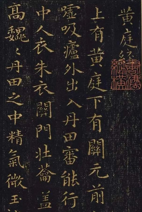 传王羲之所书小楷《黄庭经》系《外景经》。整幅作品布局排列紧密,法度严谨却字字利落,用笔起止舒展、笔势流畅,字体大小、字形正欹、笔画粗细,多有变化,体现了字间动态之美,却又保持了整体和谐。对后世产生了巨大影响。
