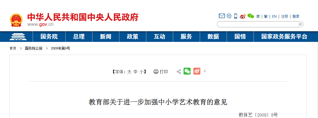 美育是国家教育方针的有机组成部分,艺术教育是学校实施美育的基本途径,是素质教育不可或缺的重要内容。随着我国基础教育水平的不断提高和素质教育的全面推进,中小学校艺术教育有了较快发展,艺术教师队伍严重不足的状况有所缓解,艺术教育教学质量逐步提高,课外艺术教育活动普遍开展,中小学生的审美素质得到提升。但是从我国基础教育发展的整体水平来看,艺术教育仍然是学校教育中的薄弱环节。一些地方和学校没有把艺术教育摆上应有的位置,艺术课程开课率不足、活动形式单一、教师短缺、资源匮乏等情况不同程度存在着。艺术教育的滞后,制约了基础教育的均衡发展和素质教育的全面推进。